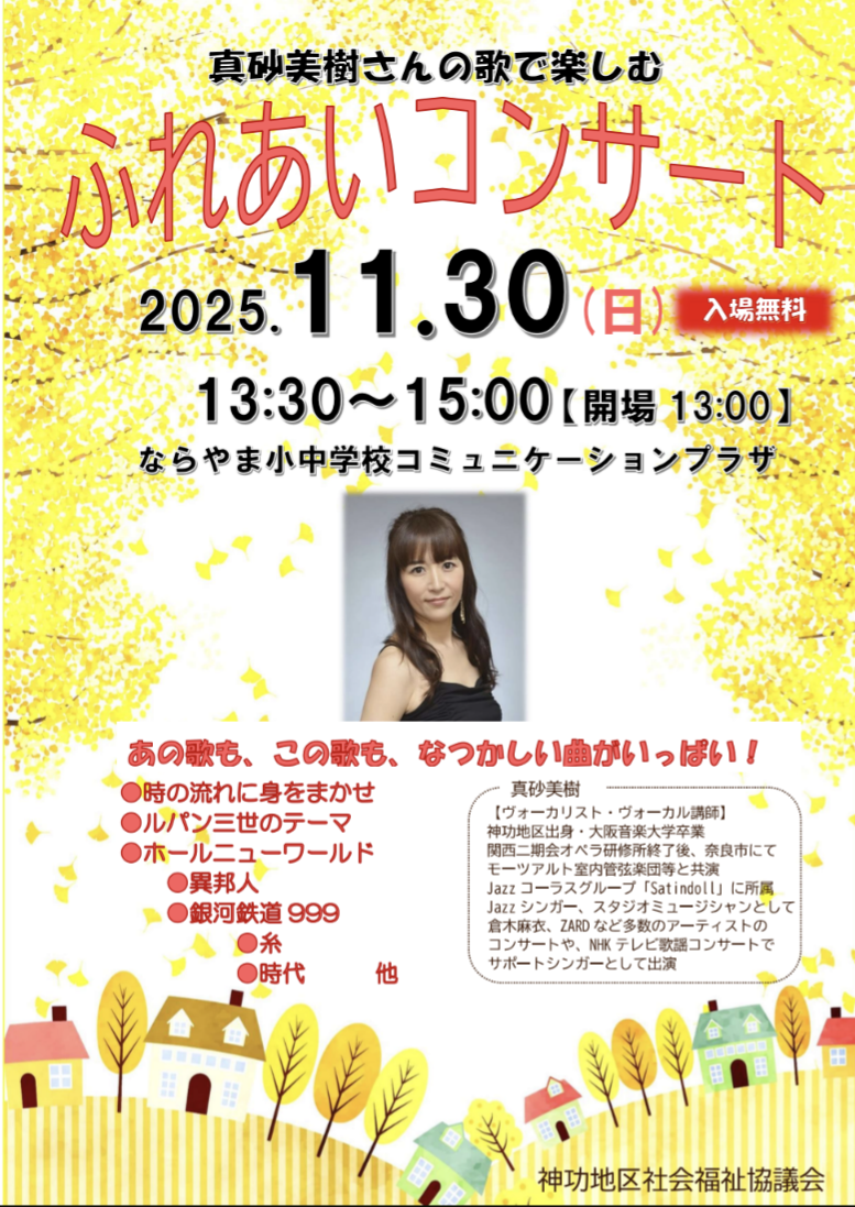 真砂美樹さんのコンサート開催しました 2025年11月30日(日) 2025 12/01 地区社協 2025年12月1日歌手の真砂美樹さんのコンサートを開催しました。日時:2025年11月30日午後13時30分~場所:ならやま小中学校コミュニケーションプラザ75名を超えるみなさまがご来場頂き、真砂さんの美しい歌声を楽しみました。 地区社協 よかったらシェアしてね! URLをコピーしました! URLをコピーしました! 11月民児協だより 「障がい者理解を深める講座」開催-25年12月7日(日)